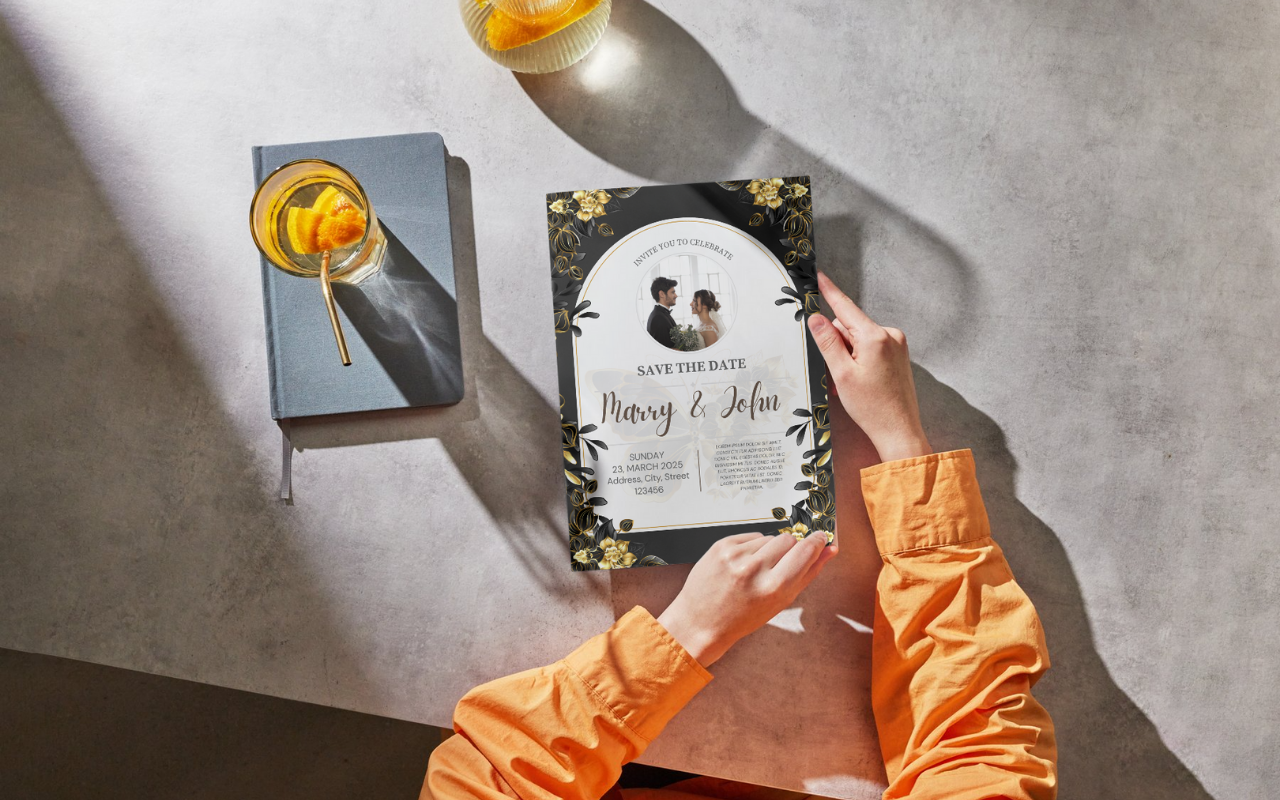 Make your big day unforgettable with this luxurious wedding invitation card template featuring elegant black and gold floral details. Perfect for modern couples, this design is fully editable in Canva — allowing you to personalize names, dates, venue details, and more with ease.